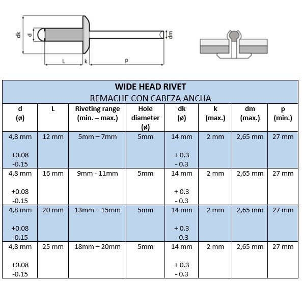 Remaches con cabeza ancha (Aluminio + Acero): plateado / negro / blanco